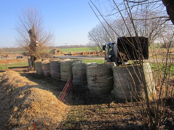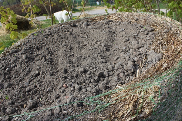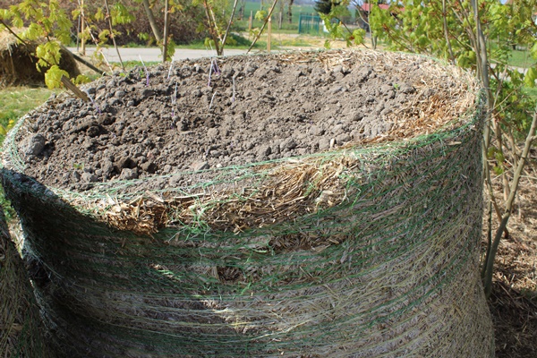 I found it a shame to trough them away, so I planted some of them. Beside the hill beds we have a row of straw bales as wind protection. These are already rotting a little on the inside, so we put some soil on there to plant the potatoes in. I also gave the potatoes some cow manure in form of pellets and covered them with some hay. Let’s see what that does this season, because I already saw that the straw bales are collapsing a little bit.
