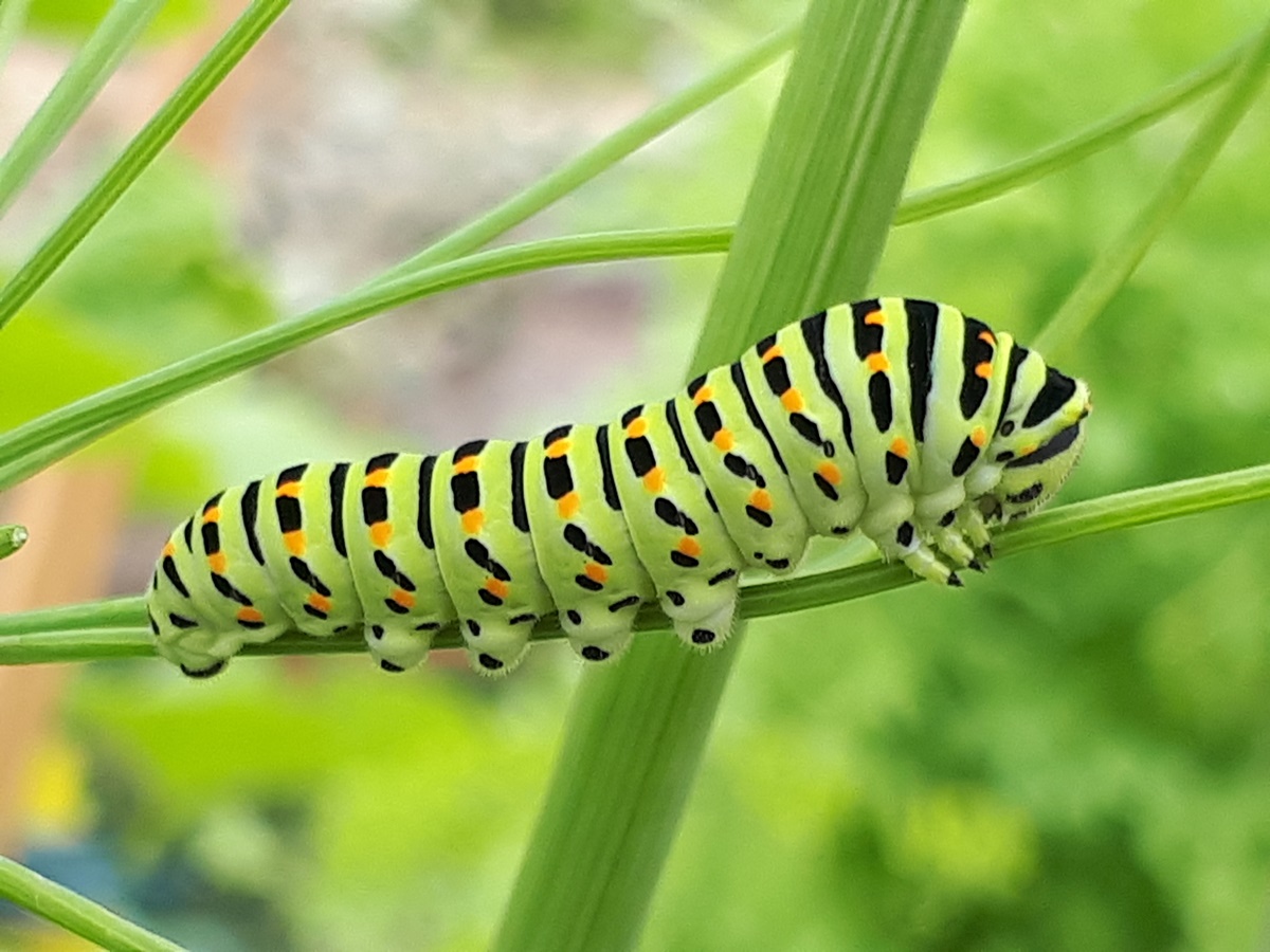 All of a sudden I found caterpillars in the dill. The better I looked the more I found. It is here where I took the picture of the swallowtail butterfly. Apparently I caught it laying its eggs. The caterpillars are beautiful and I hope all make it to become an even more beautiful butterfly.