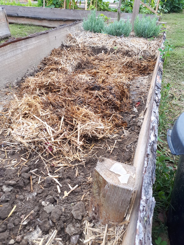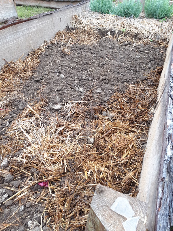If you have been following along you will know that we just filled our raised beds with normal soil. Now I am going to try and improve the soil one by one as they are emptied. I have started with one of the onion beds. With the help of the kids we dug out a generous layer of soil and put in a layer of straw. Not to thick. Than the soil came back on that and the top is covered with a layer of straw again.