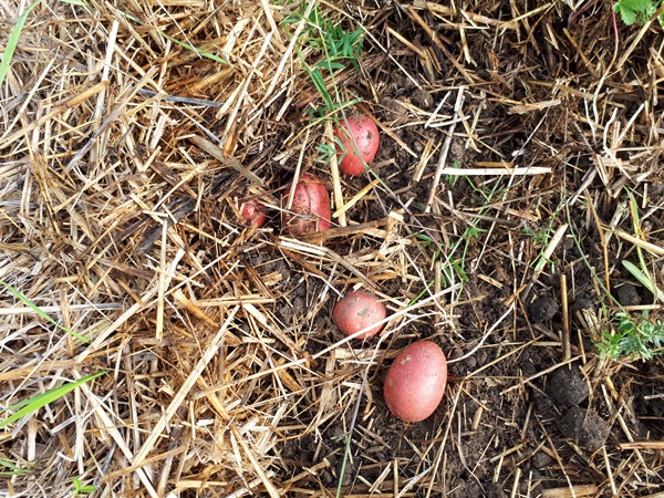 Digging out the potatoes makes a lot of fun. With the kid’s helping it is like treasure hunting. Thanks to the thick layer of straw the potatoes are not very deep, so just scraping of the straw already reveals a lot of the potatoes and we can start collecting without digging to much. I am happily surprised that despite the drought the bottom layer of straw is already decomposing and in most beds I found earthworms. Which is a very good sign, since there where none in the soil when it was brought to us in the spring.