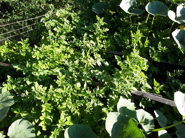 We harvested a bucket full of nice size potatoes in this corner. We lost some to mice and some sprouted again to beautiful potato plants.