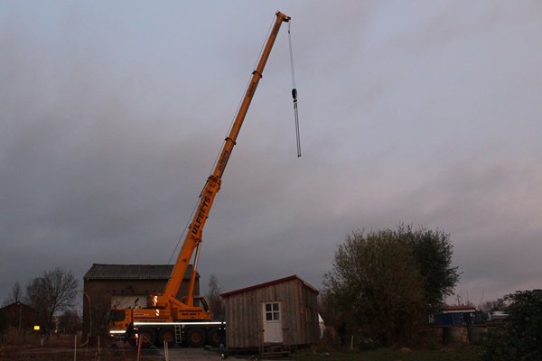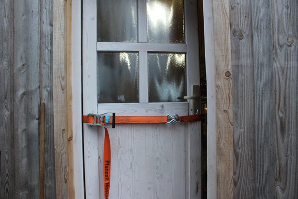 We had already ordered a new door, because we did not trust this door anymore, but it came broken and it needed to be swapped. This new door kept us waiting longer then expected and we tried to somehow get the door to at least close again. We put a lashing strap around the door to press it together and then screwed a few planks to the door.