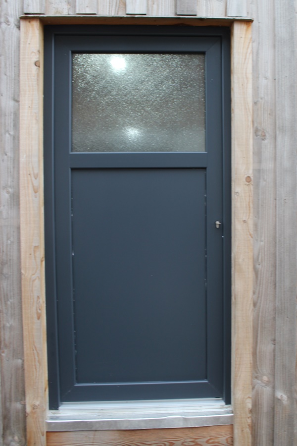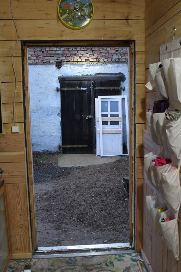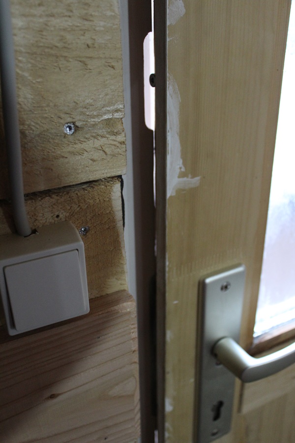 But first things first. We have a big problem whit our front door. It is a wooden door which we bought 2 years ago. At the moment we do not have the possibility to build our own door. We gave the outside a paint to give it some protection. When we build the door into the Tiny House it already was a problem fitting it. The door was warped from the beginning and did not close; we could not lock the door; etc. We reduced the door lock mechanism from a 5 point door lock to a 1 point door lock in order to get the door to shut and to be able to get locked. The doorframe also needed to be modified.