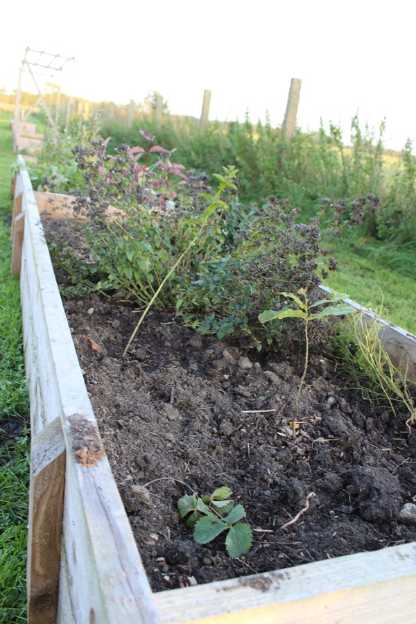 We just put the borders right on the grass and filled them back up again with the soil. We planted some trees we had grown ourselves and also all the perennial plants we had in the beds before. So we have some oak trees, corkscrew willow, oregano, marigold, chamomile, strawberry, sage, peppermint, Jerusalem artichoke, lovage, some bushes and some garlic cloves.