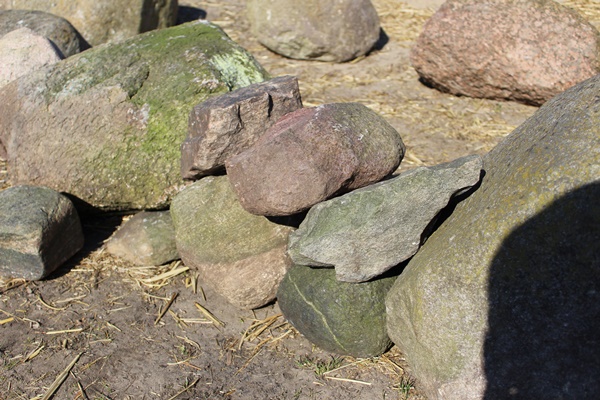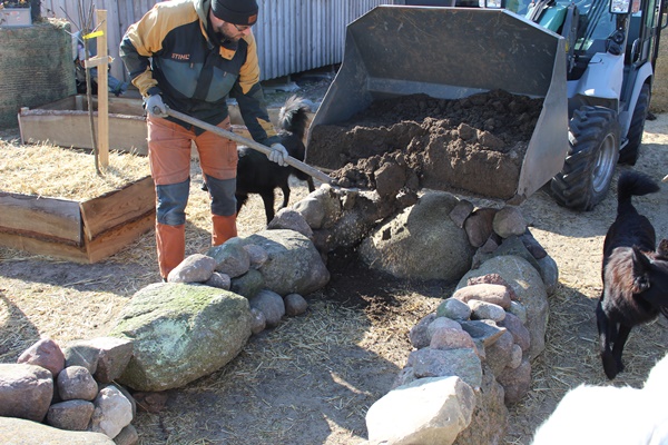 We had a lot of smaller boulders left, so we build another smaller plant bed. To get a curtain height it needs a broad base and then all that is left to do is stack the stones until all have been used. Again fill up with soil, spreading out the soil and finished is the plant bed.