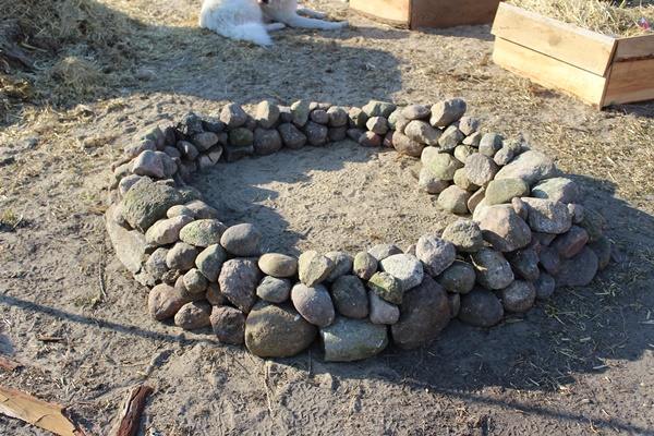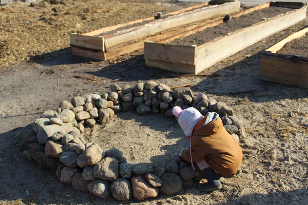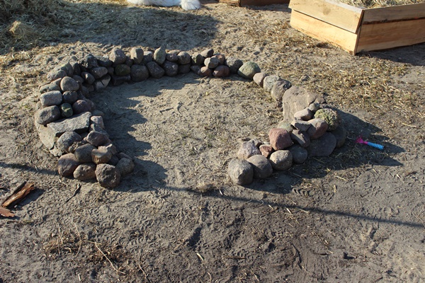 To start with my husband positioned the larger stones, after that we filled out the spaces in between with the smaller stones. Than what’s left is filling up the bed with soil, spreading out the soil and finished is the plant bed.