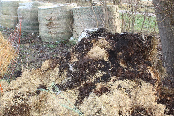 After that we wanted to cover the plant beds beside our fence we had not covered yet. Therefore my husband wanted to pick up an older straw bale, which was sitting up right since last year, to bring it to the beds with the tractor. This straw bale fell apart, because it was decomposed completely.