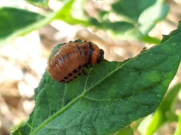 Right behind this little area is a small area where there where hardly any weeds. In this spot the potato plants are very small and full of holes. Here the Colorado potato beetle has done its thing.