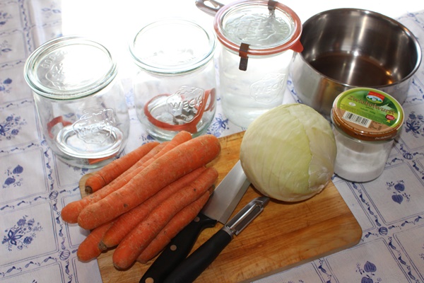 As I wrote in my post “First time fermenting vegetables” I wanted to make new fermented vegetables soon. I was grocery shopping und got a small cabbage and some carrots. For the carrots I need to prepare Saltwater. The water gets boiled and I mixed 800 ml water with 2 Tablespoons of salt. This needs to cool before using (the glass on the right).