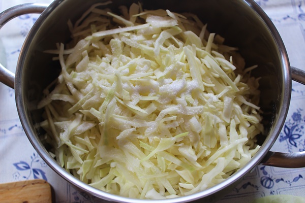 First of all I cut the cabbage very thin (and of course removed the stalk). I weight the cabbage and added 2% of the weight of the cabbage as salt. This was mixed thoroughly and put aside for about an hour to make it easier for myself.