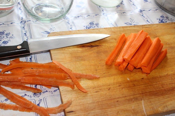 So now to prepare the carrots. I peel the carrots and cut them into sticks. Now the carrots are layered as compact as possible in the glass. Poor in the saltwater until the carrots are submerged. I put a smaller lid inside the glass directly on the carrots to keep them submerged. A lid on top and the carrots are done. I only used half of the saltwater I prepared and hat bought enough carrots, so I made a second glass with carrots.