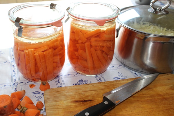 I all put it up in our barn to ferment and I more or less forgot about it. I had a glass of carrots and a glass of kimchi in the refrigerator and I usually forgot to take it out with a meal. After about 6 months I started trying to really think about it and take out these ferments with our lunch meals (We eat the main meal at lunch time). Our son still loves the carrots and ate almost all by him self, the kimchi he does not like. The girls still did not want to eat the carrots nor the kimchi. So I eat the kimchi, but after some time my daughter wanted a bite of kimchi from me and of course my other daughter then wanted a bite from me as well. As if the food tastes differently from my plate as from theirs, they all of a sudden seam to like it. Meanwhile the carrot glass is empty and the kimchi almost and I made myself on getting all of my ferments out of storage to check on them. I also had some zucchini pickled and the children wanted from these as well, so we took a glass of those inside as well.