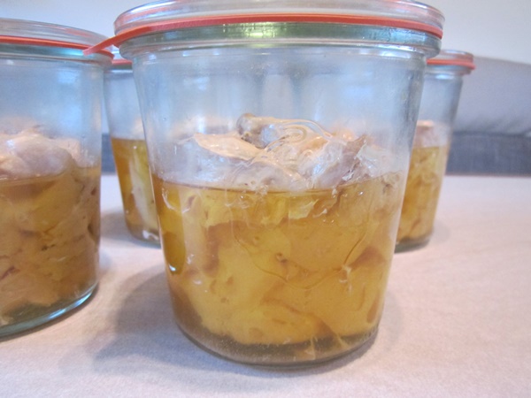 Once the meat was finished I took the canner of the stove and put my stockpot with the 4 carcasses on there to cook for the broth. I had only the chicken carcasses and water in the stockpot and had this simmer for about 5 hours, strained it and let the broth cool over night. (I had been making broth often before, but it did not smell so good and the kid’s did not want to eat things I made with it. Recently I have found out by searching in the internet that for broth, simmering for a longer period of time, you should not add vegetables, because the broth can turn bitter.) The next morning I separated the fat from the broth and heated the broth again. At the same time I heated the pressure canner with water and ¾ Liter glasses. Once the broth came to a boil I took the glasses out of the pressure canner and filled these with the broth. The amount of broth was exactly right for the glasses and the pressure canning process started again.