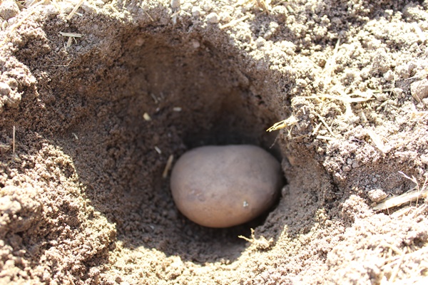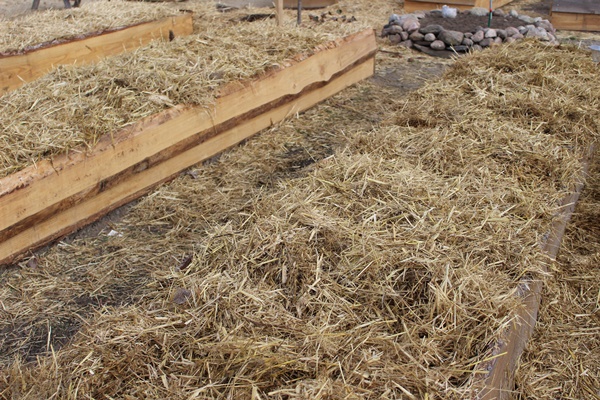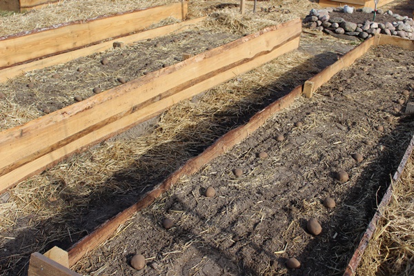 I started with the seed potatoes. Our children helped me and we planted 21 kg of seed potatoes. We planted following varieties: Aromata, Ballerina, Folva, Sava, Laura & Belana. Most of these we already hat and we liked them. We had already covered most beds with straw, so first I took the straw down from the bed, laid out the seed potatoes on there place and put them in the ground. Then I divided the straw back on the beds. We filled 11 beds with the seed potatoes.