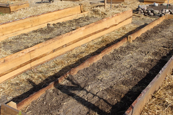 Unfortunately I could throw away half of my garlic because they had mold. My storage possibility was not so good for the garlic. So I could not even fill 2 beds with garlic. With one bed I sowed 2 rows of red beets in between the rows of garlic. With the other bed I sowed half rows with the following: Turnip, leafy greens, winter posteline and Asian salad mix. For the garlic I had following varieties: Edenrose, Flavor, Cledor. Here I also put a thinner layer of straw to cover the bed.