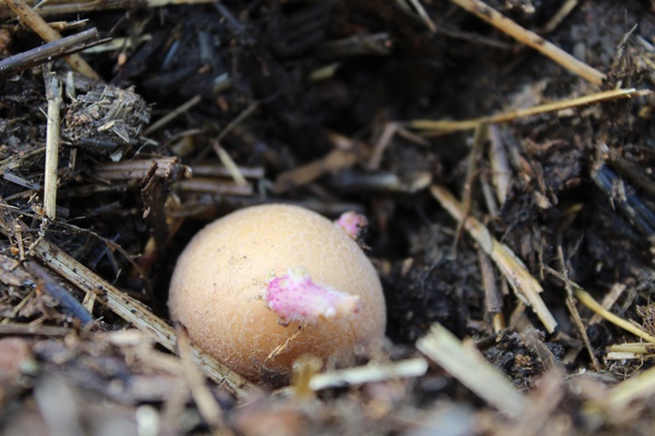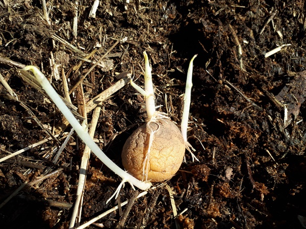 Potato popping trough the hay