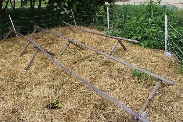 I started with the seed potatoes. Our children helped me and we planted 21 kg of seed potatoes. We planted following varieties: Aromata, Ballerina, Folva, Sava, Laura & Belana. Most of these we already hat and we liked them. We had already covered most beds with straw, so first I took the straw down from the bed, laid out the seed potatoes on there place and put them in the ground. Then I divided the straw back on the beds. We filled 11 beds with the seed potatoes.