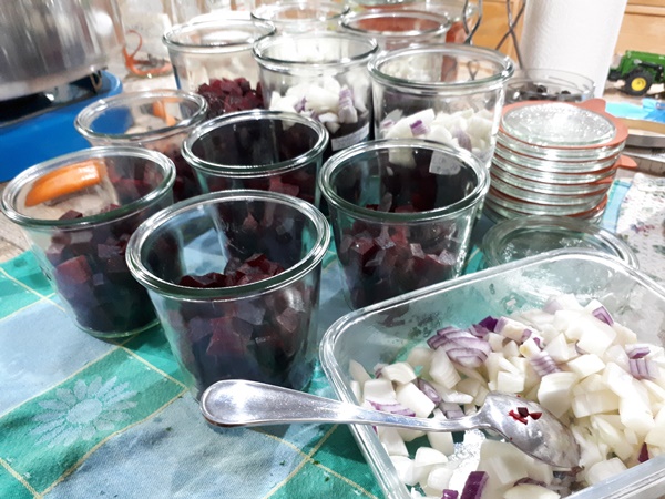 When we came back from our holiday we had snow and it was cold. I was worried that my red beets (which I did not manage to harvest all before we left) would freeze and I could not use them any more. Therefore the first thing I did was harvest all of the red beets and processed them with the pressure canner to shelf stable soup.