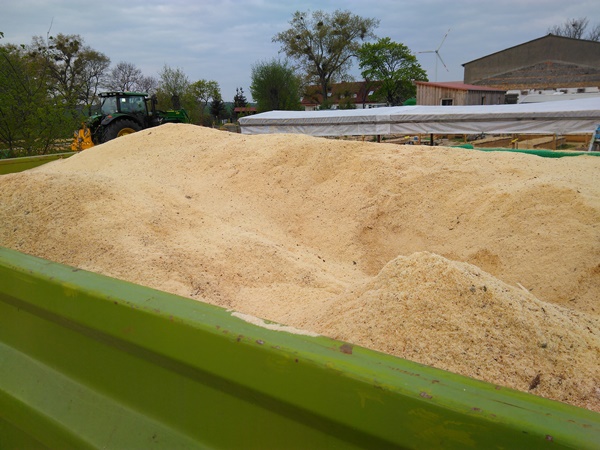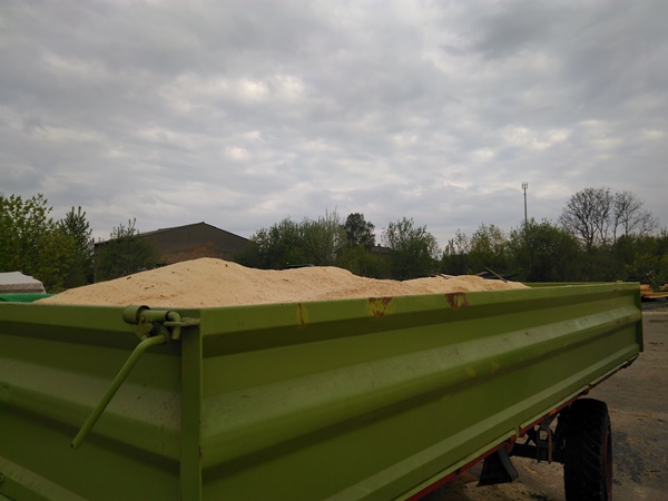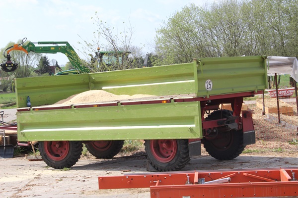 Attached to the sawmill was a big bucket for collecting the sawdust. This bucket was emptied in the trailer. At the end we filled 3 trailers with sawdust, but underneath the sawmill still was enough left behind.