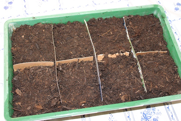 Then I prepared rows over the entire bed and started sowing. I put a marker with the variety at the start of the row and sowed following: