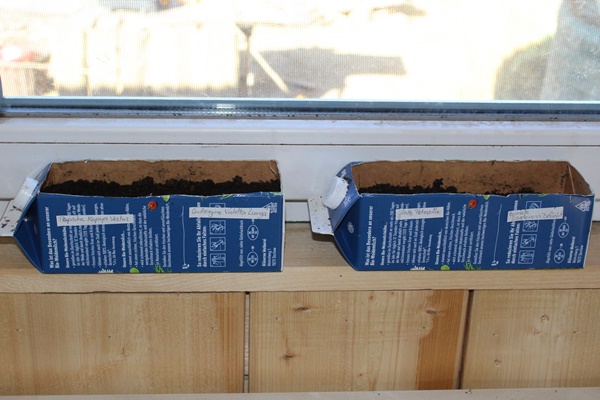 The sweet peas where sown with a useful spacing, so these might stay in this bed. How ever the onions where sown very thickly, so I must be careful when I transplant them. We use a lot of onions, so I wanted to sow many extra (beside the onion sets I already put in the ground). I also want to use the green of these sowed onions in green salads during the spring and summer.